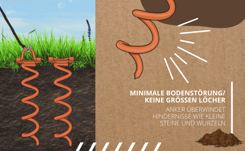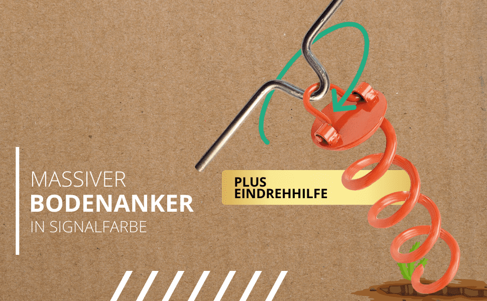 Auch wenn du den Anker nicht benötigst, kann er im Boden belassen werden. Der Erdanker liegt nur flach am Boden auf und so wird die Verletzungsgefahr minimiert. Die knallige Farbe des Ankers lässt dich diesen immer wiederfinden. Dank des Klappringes am Kopf des Spiralankers kann der Anker einfach im Boden bleiben.