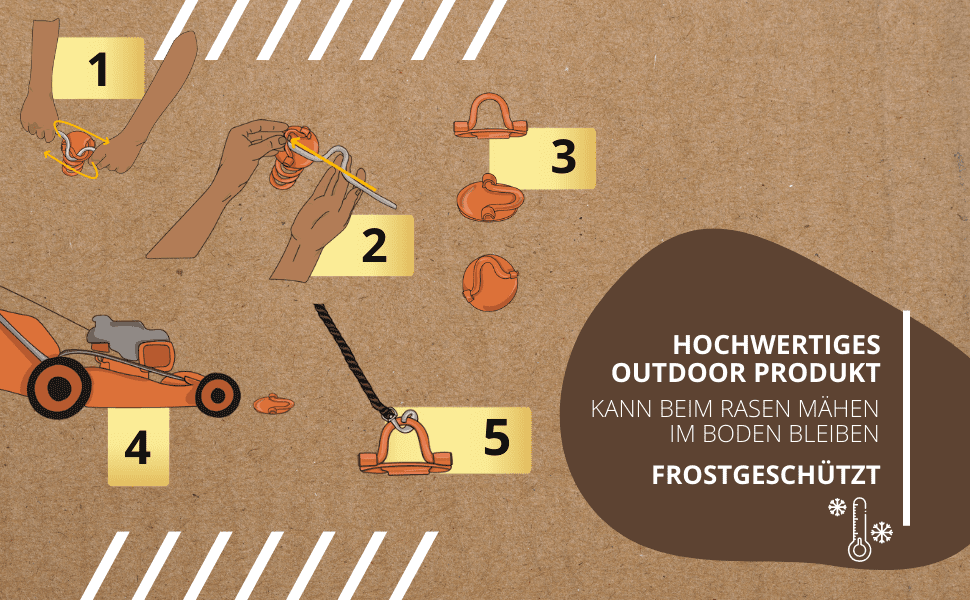 Sicherungsseile können schnell und dauerhaft im Boden befestigt werden. Das Trampolin bleibt so auch bei starkem Wind stehen.