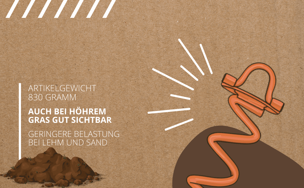 Da er nun flach am Boden liegt, besteht eine minimierte Verletzungsgefahr, etwa weil jemand barfuß auf den Ankerkopf tritt oder ansonsten gar gestolpert wäre. Die signalorangene Farbe verhindert ein Übersehen und macht den Erdanker darüberhinaus jederzeit problemlos auffindbar, wenn er nicht in Benutzung ist.