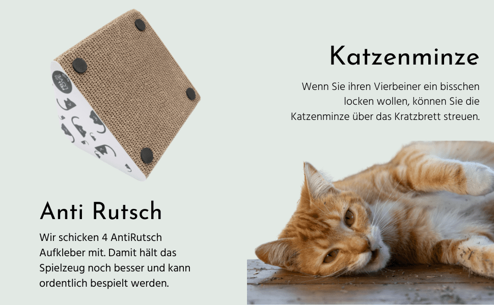 Dank des kompakten Designs passt das riijk Katzenspielzeug wie eine Kratzmatte für Katzen in jede noch so kleine Ecke. Die Anti-Rutsch-Ausrüstung für die Unterseite sichert rutschfesten Spielspaß. Extra robust, schadstoffgeprüft und umweltfreundlich.