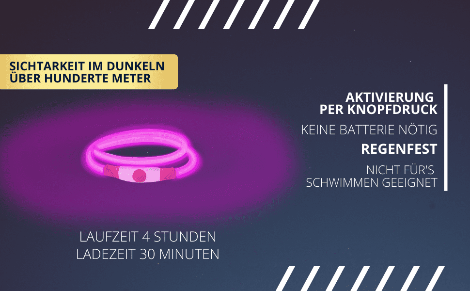Das LED Halsband bringt deinem Hund die Sichtbarkeit und Sicherheit die er im Dunkeln braucht. Abends, Nachts oder bei schlechten Wetterverhältnissen, ist dein Hund gut sichtbar und Rad- und Autofahrer nehmen den Vierbeiner besser wahr.